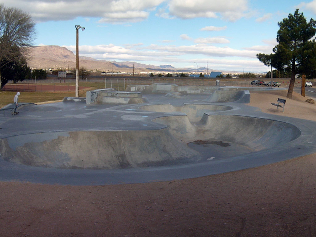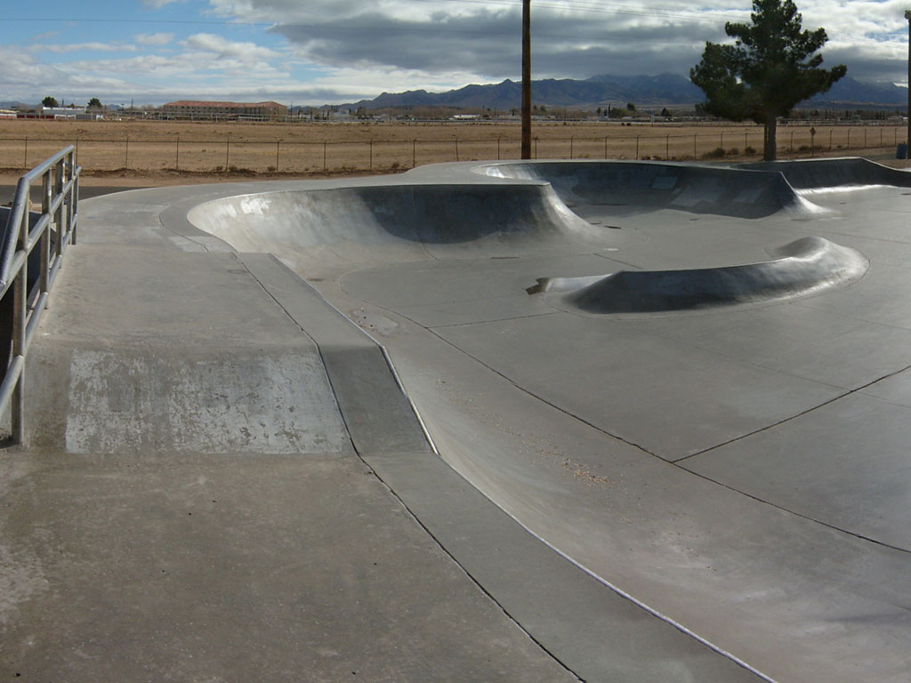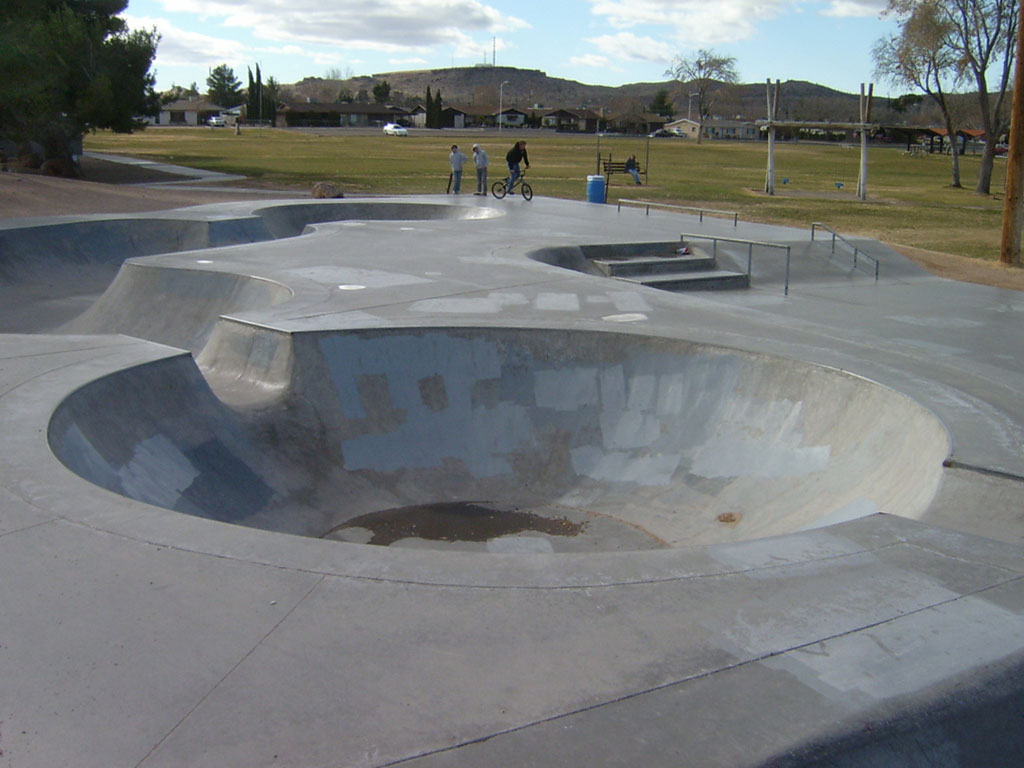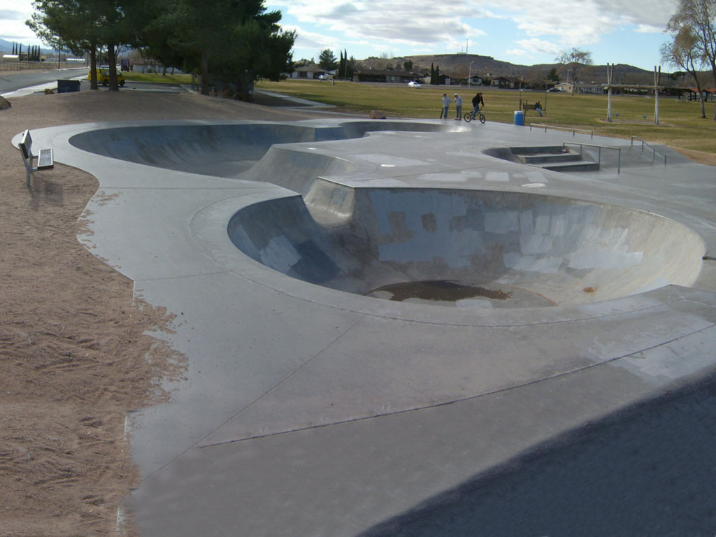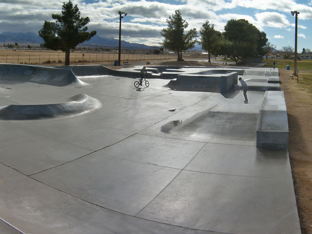 Kingman Skate Park is located inside of Firefighter's Memorial Park in Kingman, Arizona. It is a 12,000 square foot poured concrete skate park. This street-style park has a 3-stair set with rail, two fun boxes with ledges, two quarter-pipe vert ramps, and some banked terrain. There are three shallow bowls at this park. A unique feature of this park is a small concrete berm. The park has lights for night skating.