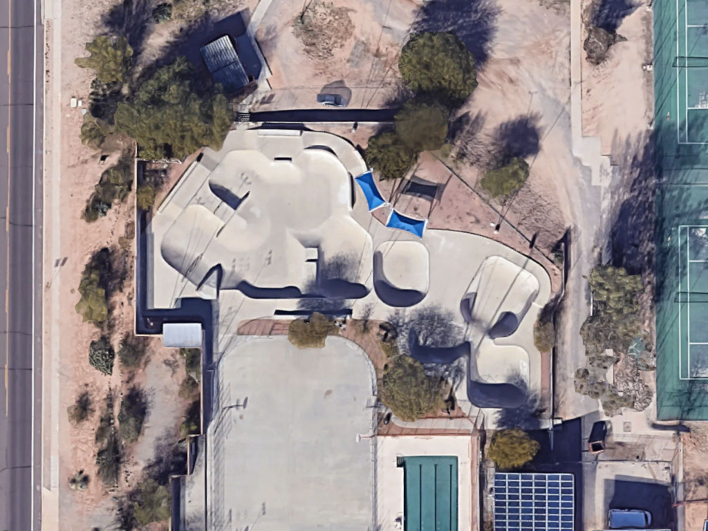 Ott Family YMCA Skate Park is located in Tucson, Arizona. It is a 15,000 square poured concrete skate park. To skate here, you will need a YMCA membership or day pass. This is a well designed park with a large 3-clover bowl, smaller bowl with spine transfer, and a street-style area. The park has transition areas with fun boxes and grind rails to practice your skills. Two long ledges provide grind opportunities. A shaded seating area offers a great spot to rest. Contact the Ott Family YMCA for hours.